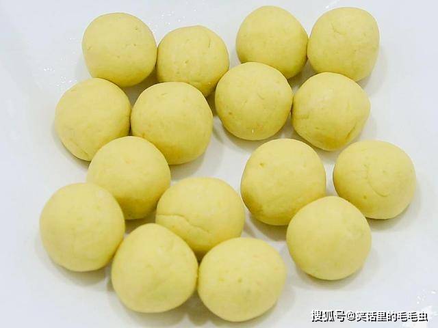 揪下一个小面剂子,用手心揉成大小均匀的小圆球以后 ,全部放在盘中。