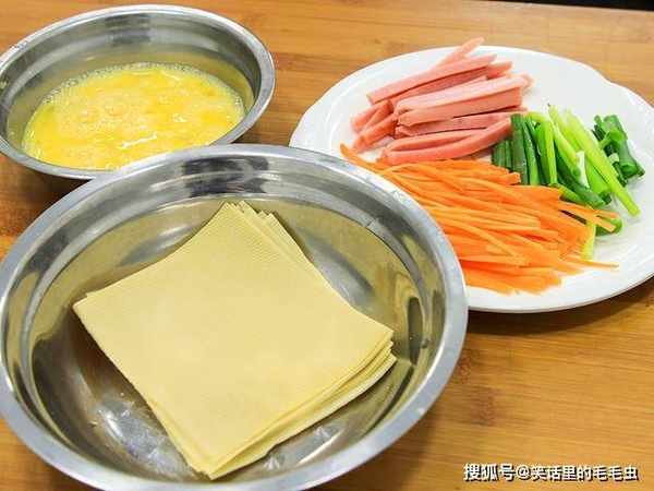 两张豆腐皮从中间划开切成四方块;半个胡萝卜切成细丝;一根火腿切成长条;几根小葱切成段;四个鸡蛋打入碗中,加入一点食盐搅拌均匀。