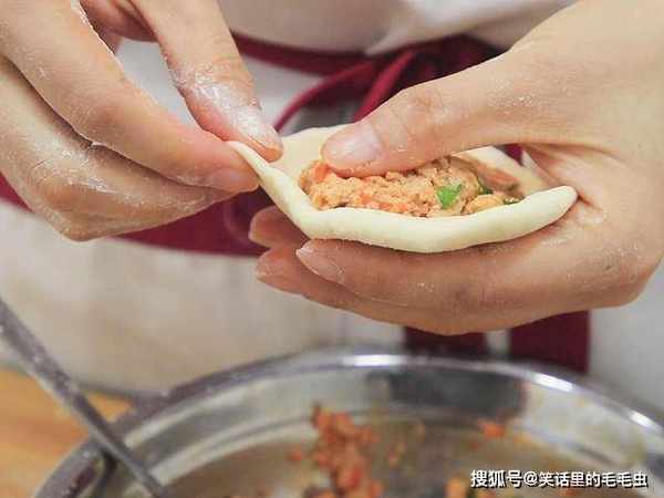拿起一个擀好的面皮,放入馅料用勺子把馅料按实,掂起面皮的一个边一点一点地折起来。手间不停旋转,按照这个方法包好所有的包子,每个包子留点空隙,盖上保鲜膜二次发酵10分钟。