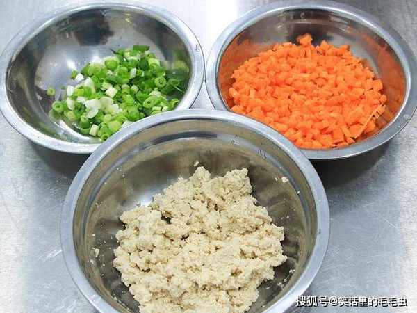 胡萝卜切成粒;小葱切成葱花;老豆腐一块用手抓散抓成豆腐泥,放在同一个盆中,加入食盐2克、五香粉2克、鸡粉1克、芝麻香油2克、再加入3克红油和2克老抽搅拌均匀即可。