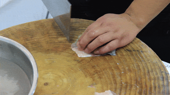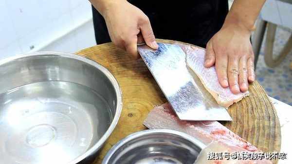 2.先将其中一片鱼肉斜刀45度,从鱼肉切至鱼皮并使皮相连,连续切5刀切断后,再用直刀从上往下切至鱼皮上并相连,除鱼皮相连外,每一根鱼丝都一定要切断,切忌连刀,否则油炸过程中花瓣伸展不开,切好以后用清水冲洗干净。