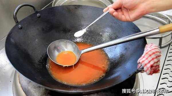 9.下面,我们制作一下菊花鱼的浇汁:锅内烧油,油热以后放入姜丝,倒入番茄酱15克,不停翻炒,然后加入适量的清水,倒入白醋8克、食盐2克、白糖20克、搅动化开白糖以后。