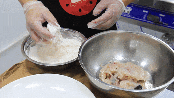 6.把切好的鱼片放在干淀粉中拍匀,拍粉可使干淀粉均匀的裹在每一根鱼丝上,充分吸收鱼肉表面的水分,既起到挂糊的作用,又可使鱼丝分离,为炸制时形成美观的形态提供条件,一个一个裹好鱼丝,放在盘中。