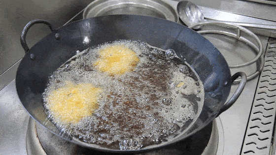 7.下面,我们把鱼片下锅炸制一下:锅内烧油,油温五成热时先用手捏住鱼皮两边,抖开鱼丝使花瓣展开,定型以后再松手放入锅中,中小火炸制四分钟,等到菊花鱼炸到金黄捞出控油。