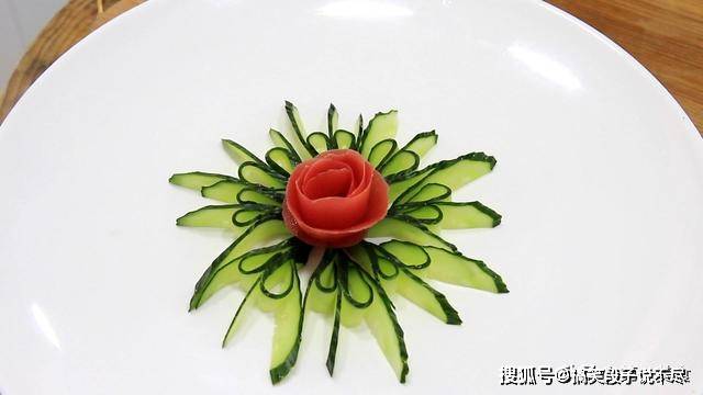5.食材准备好以后,我们进行下面的操作:黄瓜切成两半,取其中的一半切成五刀连在一起的黄瓜片,做一个黄瓜片的造型,再削点西红柿外皮做出一朵花的形状。