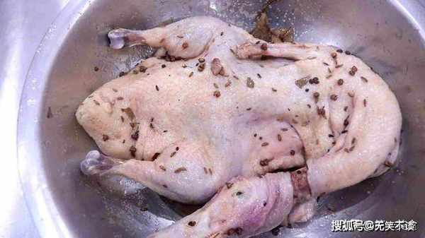 4.这个时候鸭子也浸泡好了,我们把它捞出来,挤干水分腌一下,把刚刚炒好的椒盐倒在鸭肉上面涂抹均匀,胸腔里面也要抹上椒盐,全部抹好以后,静置腌制2个小时以上,让咸味渗入到鸭肉里面,等我们煮的时候,恰好能中和掉一部分食盐,这样做出来的鸭子,更加咸香可口。