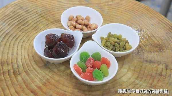 准备花生米20克,葡萄干20克,瓜子梅(红青)30克,大个蜜枣4个。