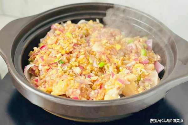 第三步:准备一个砂锅,在锅底倒一勺油,然后摆满蒜籽,接着将切好的鸡肉摆在蒜籽上,最后开大火,将鸡肉焗10分钟。