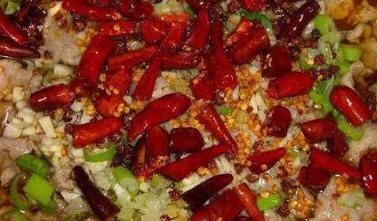 最后在盆里放上剩下的蒜末,辣椒粒,还有花椒粒【花椒末也可以】,干辣椒末,用烧热的油泼一下就可以享用了