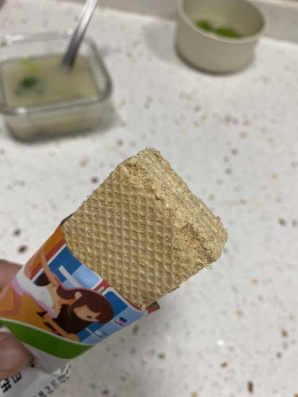 ▲这个威化曲奇和上面推荐的蛋白棒是一样的。它有威化饼的味道。这款豆浆味道比较温和,因为很好吃,所以不容易吃多。