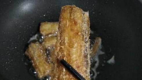 热锅冷油,油热加入八角花椒,将裹满蛋液的带鱼段放入热油锅中炸制,炸制两面金黄即可控干油分,也可以少放一些油,分成几次将带鱼炸熟