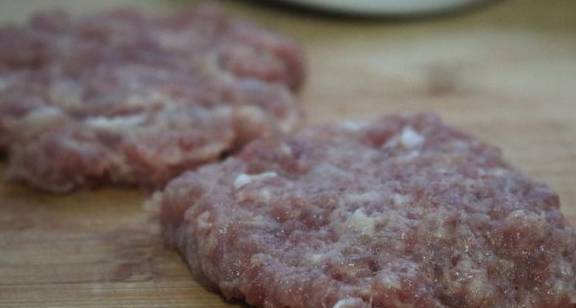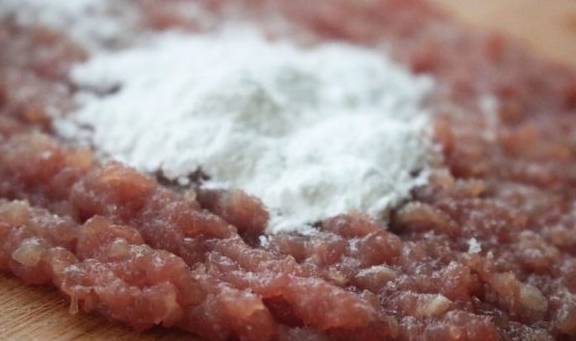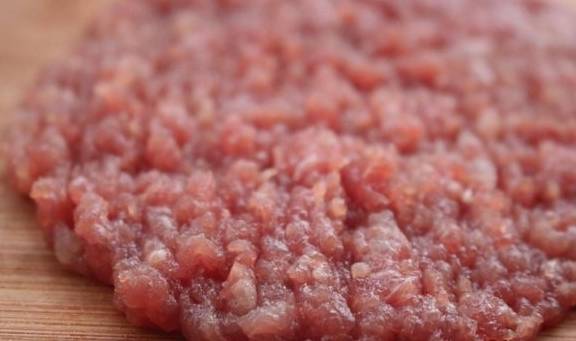 2、加入盐、淀粉搅拌均匀,捏压成大小均匀的肉饼(盐一定要少放!一定要少放!一定要少放!重要的事情说三遍)。