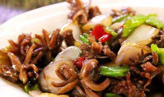 6、锅留余油,回置旺火上,投入调好的卤汁,顺同一方向搅动一下,立即倒入泡油的猪腰,翻锅后淋上明油即可装盘食用。