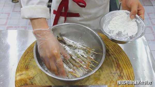 20分钟以后,虾已经入味了,我们把虾上面均匀的裹上干淀粉。
