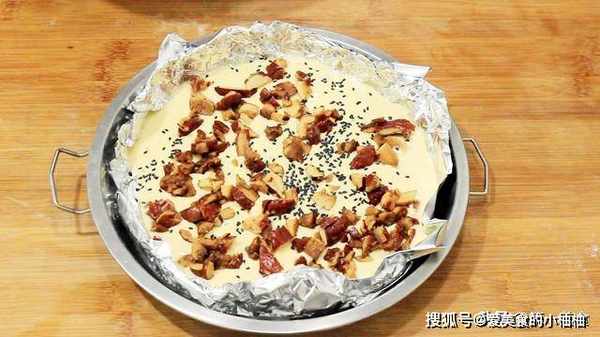 取一个深一点的盘子,刷上植物油后,在里面垫上锡箔纸,方便蒸熟以后脱模。把玉米面糊倒在里面,均匀撒上黑芝麻,再切一些红枣粒也撒在上面。用盘子盖住后,先发酵20分钟,发酵至面糊膨胀鼓起,这样蒸出来的枣糕才会更加蓬松暄软。