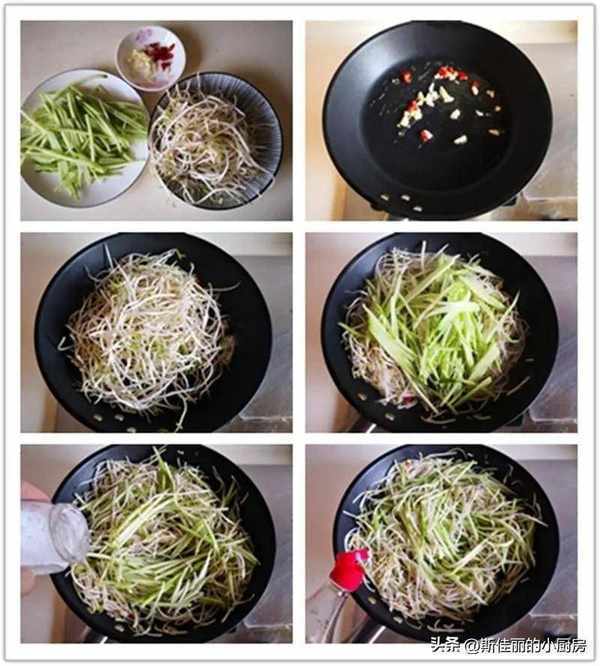 制作:1. 准备好食材; 2. 热锅凉油,将少许蒜末和红椒圈放进锅中爆香; 3. 加入洗净的豆芽进锅翻炒; 4.加入准备好的黄瓜丝进锅翻炒; 5. 再加入适量的盐调味翻炒均匀; 6. 最后沿着锅边烹入少许白醋进锅翻炒均匀即可。