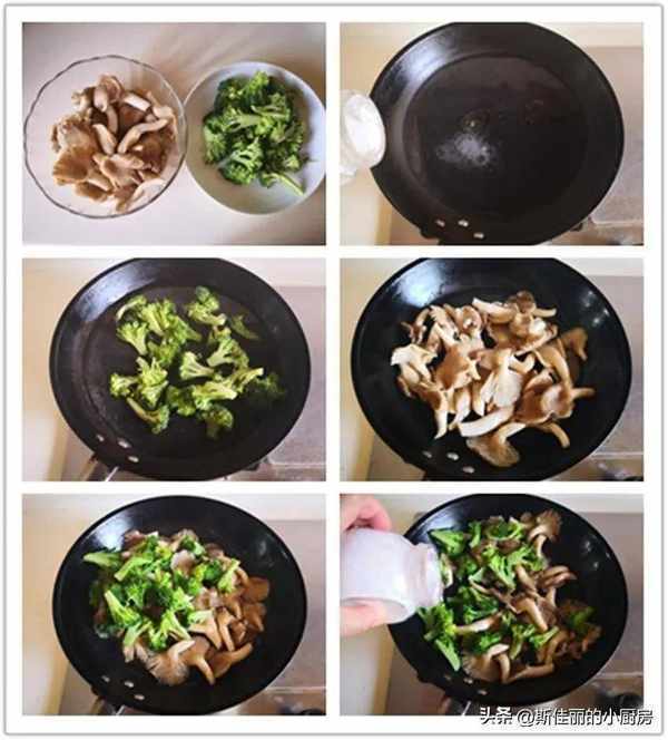 制作:1. 准备好食材; 2. 烧锅水加入少许盐和油; 3. 将西蓝花放入锅中烫变色后捞出备用; 4. 热锅凉油,将平菇放进锅中翻炒几下; 5. 平菇炒软后加入西蓝花进去继续翻炒; 6. 最后加入少许盐调味翻炒均匀即可。