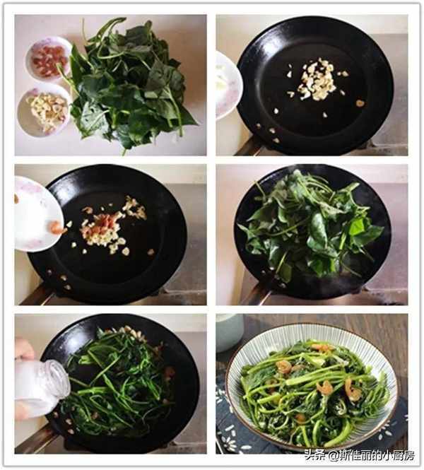 制作:1. 准备好食材,干虾仁用冷水浸泡五分钟;2. 热锅凉油,将少许蒜末进锅爆香; 3. 将泡好的虾仁放进锅中煸炒; 4. 放入洗净的红薯叶大火快炒至微微变色; 5. 最后加入适量的盐调味翻炒均匀; 6. 盛入盘中。