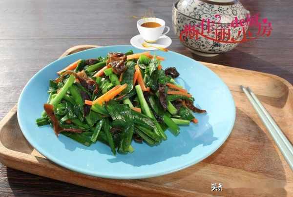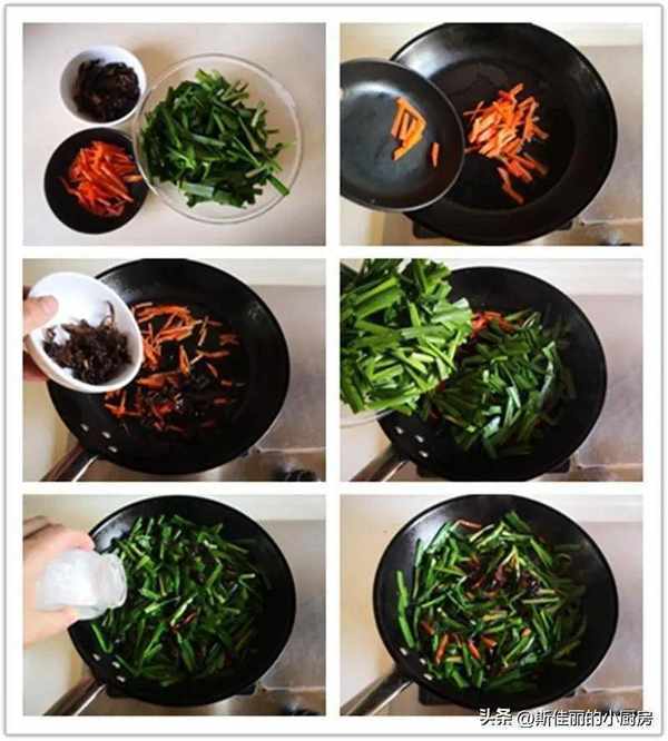 制作:1. 准备好食材, 将黑木耳用冷水泡软; 2. 热锅凉油,将胡萝卜丝放进锅中翻炒几下; 3. 加入准备好的黑木耳丝进锅翻炒几下;4. 加入韭菜段进锅大火快炒; 5. 韭菜微微变色后加入少许盐调味; 6. 翻炒均匀即可。