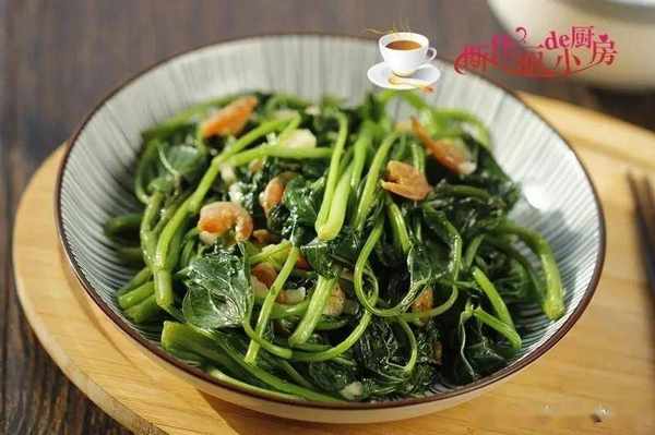 原料: 红薯叶 金钩(干虾仁) 蒜 油盐
