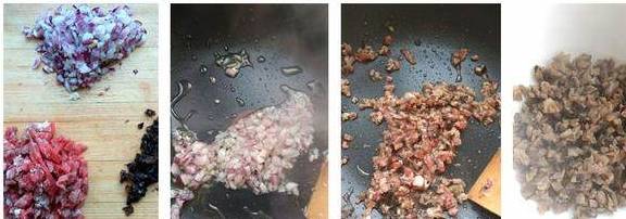 将洋葱、水发木耳和牛里脊肉切成碎末,热锅热油爆香洋葱后,将洋葱炒软,下牛肉和木耳,加入盐、料酒和生抽,炒熟后盛出晾凉备用。小提示:洋葱补钙,木耳清肺,和牛肉一起炒,还吃又有营养。