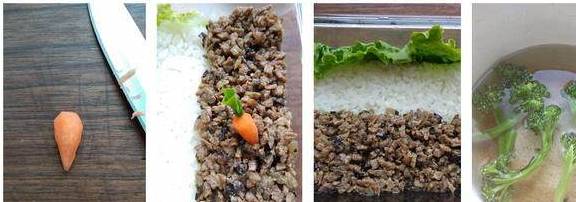 3.用刀将洗净的胡萝卜切出一个长的三角锥形,再修成圆锥形,在顶端用牙签扎个孔,揪一点生菜叶卷起来,插入孔中,就做成了一个仿真胡萝卜。把生菜叶洗净擦干,铺在饭盒底部,再盛好米饭压平整,把炒好的牛肉脯平,盖住一半米饭表面。用盐水把西兰花炒熟,沥净备用。