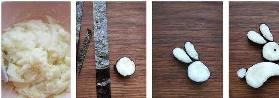 2.将山药洗净,入蒸锅蒸熟后剥皮,碾成泥。将做寿司用的海苔片剪成手指宽的长条,围住用手捏成圆形的山药泥。同样做出耳朵和身体、尾巴等部位。眼睛用一粒黑芝麻即可。小提示:山药补气,但是一般孩子都不爱吃,做成可爱的形状就没问题了。