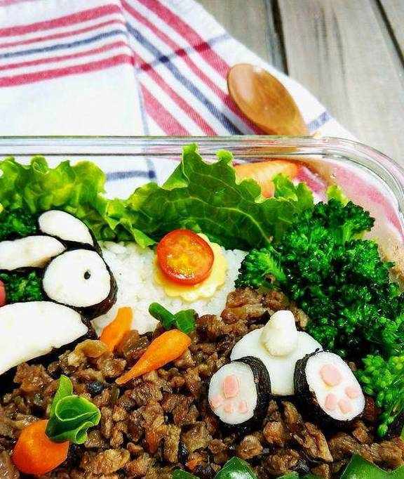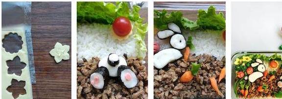 用这个便当为例:做好的米饭铺在保温饭盒底部,上面是洋葱炒牛肉和木耳,模仿泥土的颜色,小兔子是蒸熟的山药泥和海苔组成的,还有西兰花、香肠、胡萝卜和生菜、圣女果,组成了一幅有故事情节的画面:在田野里偷懒玩儿了一天的小兔子们,要趁着太阳下山前,赶快拔完胡萝卜回家了。