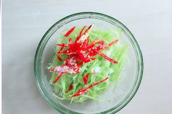 2、将泡好的莴笋丝捞出,沥干水份放入盘中,加上红辣椒、盐、白糖,充分拌匀;