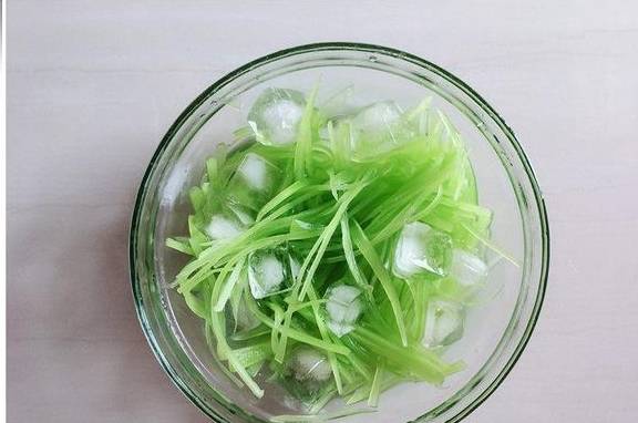 1、莴笋去皮洗净切丝,将切好的莴笋丝放入有冰块的凉开水中,浸泡20分钟;