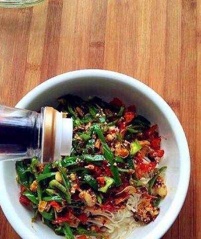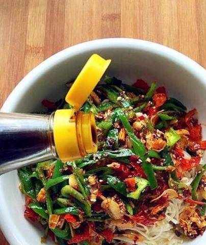 浸泡的金针菇轻轻的挤干水分,放入一个比较大的容器当中,把锅里的料放入到金针菇上面,滴入1.5勺生抽,就是平时白色搪瓷勺子