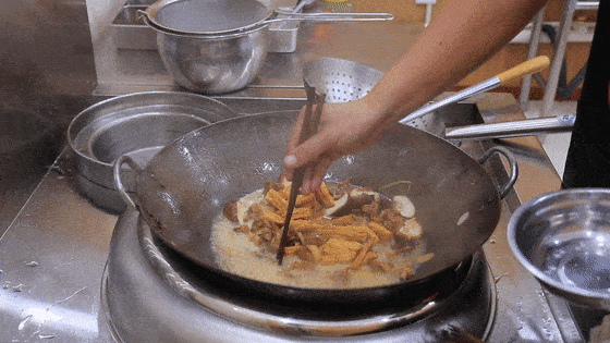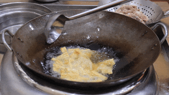 锅内烧油,油温5成热时把腐竹倒入锅中。速炸30秒钟左右,等腐竹变色起泡以后,倒出来控油备用。