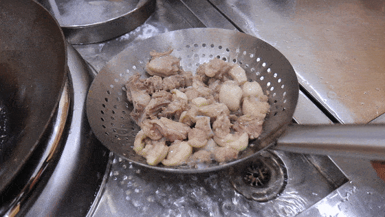 锅中添水,把鸭块冷水放入锅中焯一下。焯水时倒入一点料酒去腥,煮出里面的血水和杂质。等水烧开以后,打去锅中的浮沫,大约煮2分钟,把鸭块倒出来,用清水冲洗干净备用。