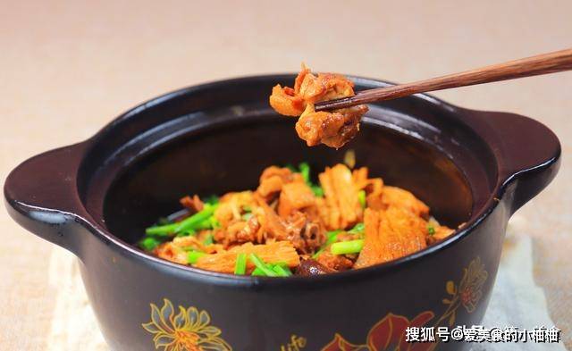 倒入香菇和炸好的腐竹,把锅中的葱段挑出来,因为葱段久煮会有异味。之后加入生抽10克,搅拌均匀后,把鸭块倒在砂锅中。先大火烧开以后,再转小火焖煮30分钟。