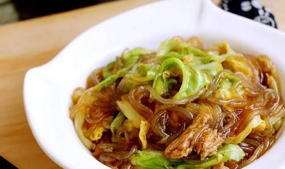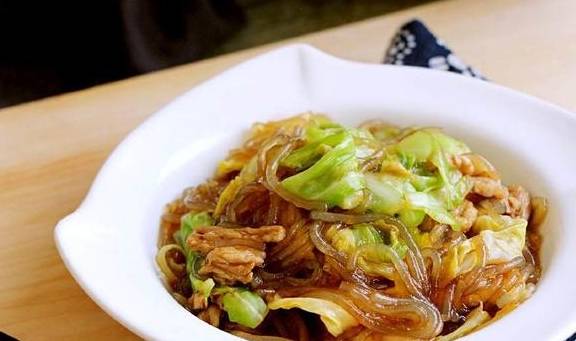 6包菜发蔫,微微出汤,放入控干水的粉条,加盐调个味,翻炒均匀即可关火装盘