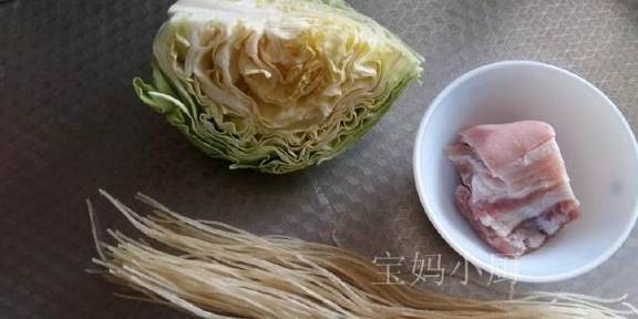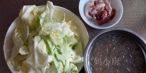 3包菜撕成片,泡水洗净,控干水备用;五花肉去皮切片;煮好的粉条泡在凉水盆中