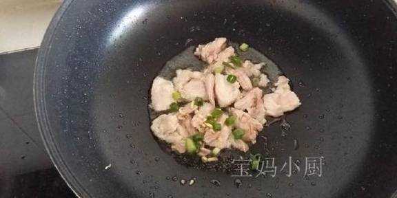 4炒锅放植物油,油温4成热,放入五花肉片翻炒至变色,加葱姜末炒香