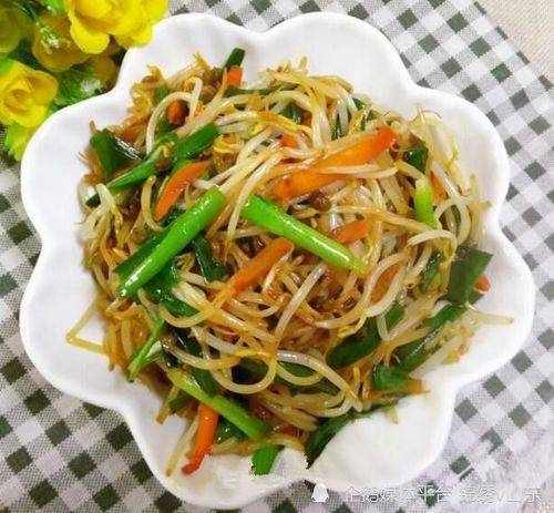 4、炒到豆芽变软,加把韭菜进去翻炒,照自己的咸淡程度添加适量的盐,翻炒均匀。