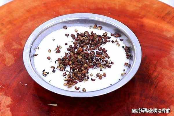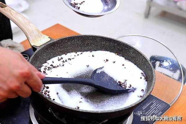 把锅烧热,直接倒入倒入食盐和花椒一起翻炒,把食盐炒热、炒出花椒的香味,然后把食盐盛出了不部分,剩下的在锅中摊平。