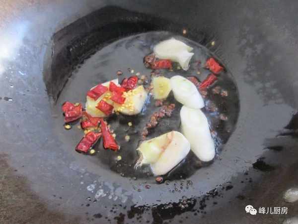 5、锅里放油,放花椒,八角,葱,姜,干辣椒炒香。