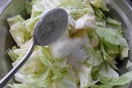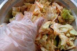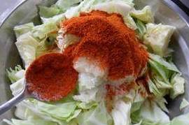 3、放入各种调料的泡菜一定要多用手抓拌一会,在抓拌的过程中如果有卷心菜亲密的重叠在一起的,就要毫不留情的用手把它们分开,以便使泡菜能够更好地入味。