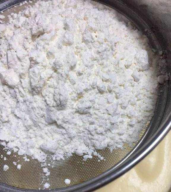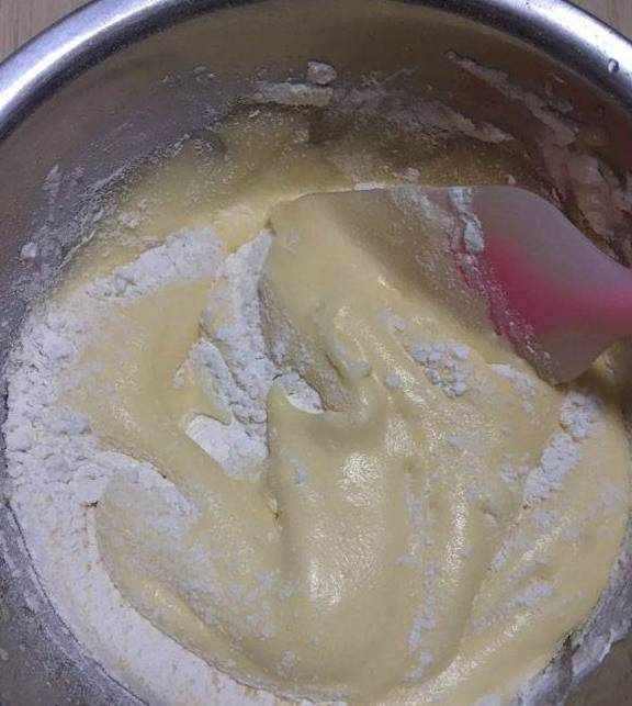 3.将面粉筛入蛋糊内,尽量使用筛入的方法,以免消泡;