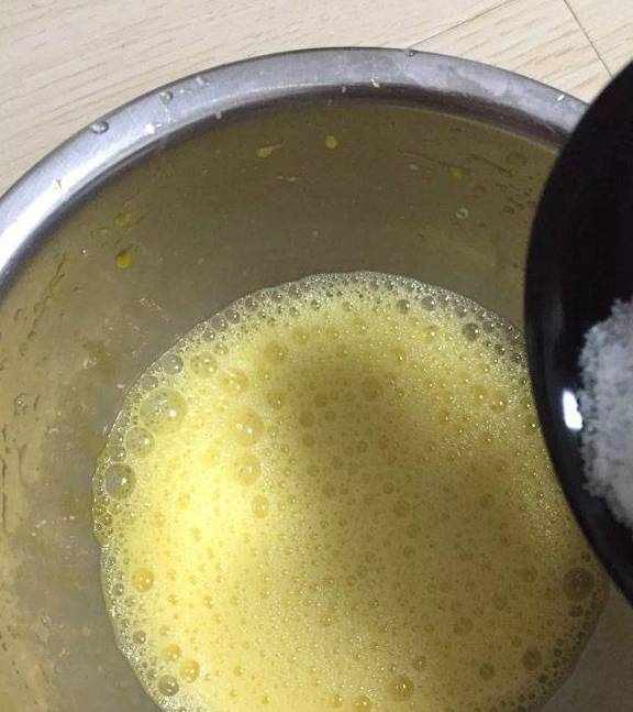 1.鸡蛋提前从冰箱里拿出,打入盆内,加入白糖,用打蛋器打发;