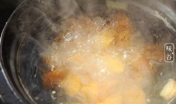 3、锅里放进番薯块和姜片,倒入适量的清水,大火煮开后转中火煮20分钟;