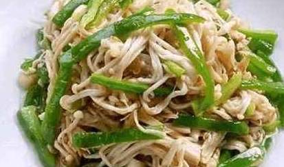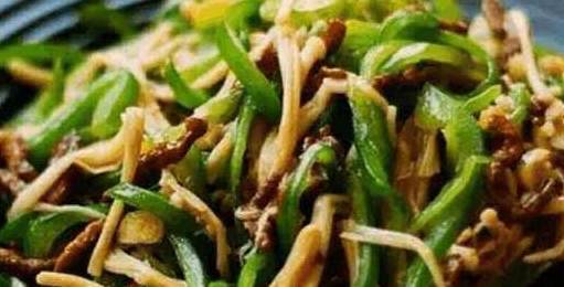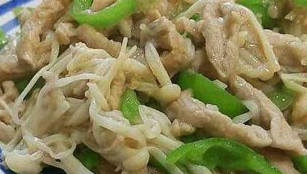之后我们起油锅,把肉丝倒进去煸炒,等到肉丝变色之后捞出来备用。之后再把金针菇给倒进锅中,翻炒半分钟后把青椒给加进去,加盐来调味。