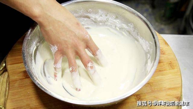 在盆中放入泡打粉3克、淀粉30克、面粉30克,淀粉和面粉的为比例为1:1,家庭做的话就不放泡打粉了。另外再加入实盐1克、白糖5克以及适量清水,调成可以拉丝的面糊即可。