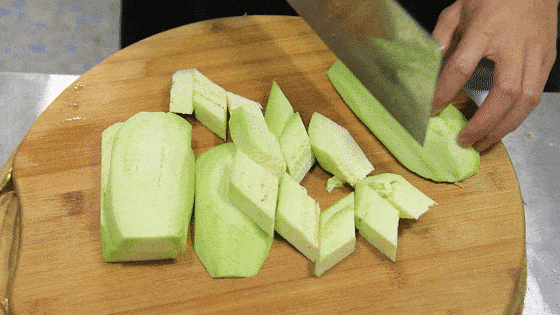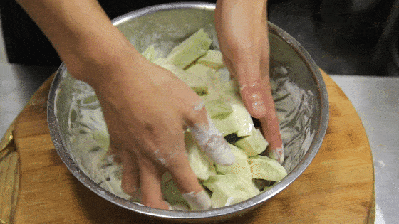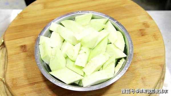 加入适量清水,浸泡等待10分钟左右。一来能减少茄子的吸油量防止口感过腻。另一方面,是为了保持茄子的色泽,防止茄子氧化变黑影响品相。