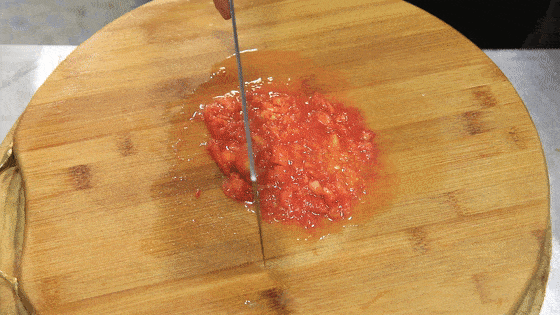 一把大蒜,拍散之后切成蒜末备用。取碗放入几个千禧果,加入热水浸泡2分钟左右,再去皮剁碎备用。千禧果最好剁的细一些,这样翻炒出来的汁水更多、也更浓郁,如果没有千禧果的话,也可以用番茄代替。