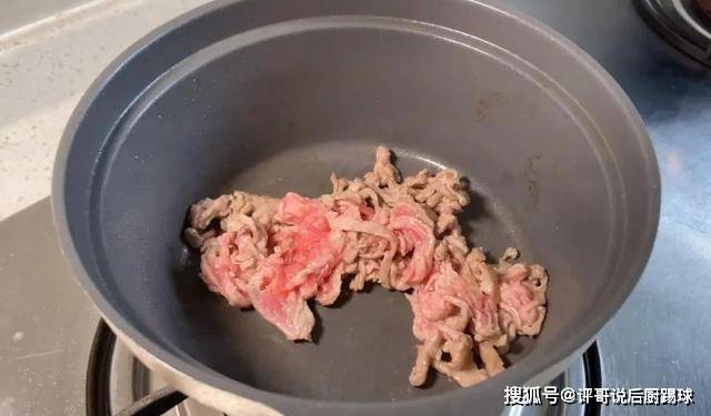 3、接着热锅,放少许油,倒入切块的牛肉翻炒十几秒。