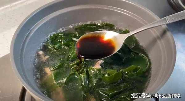 6、加一勺食盐、一勺料酒,两勺酱油调味,煮沸1分钟。